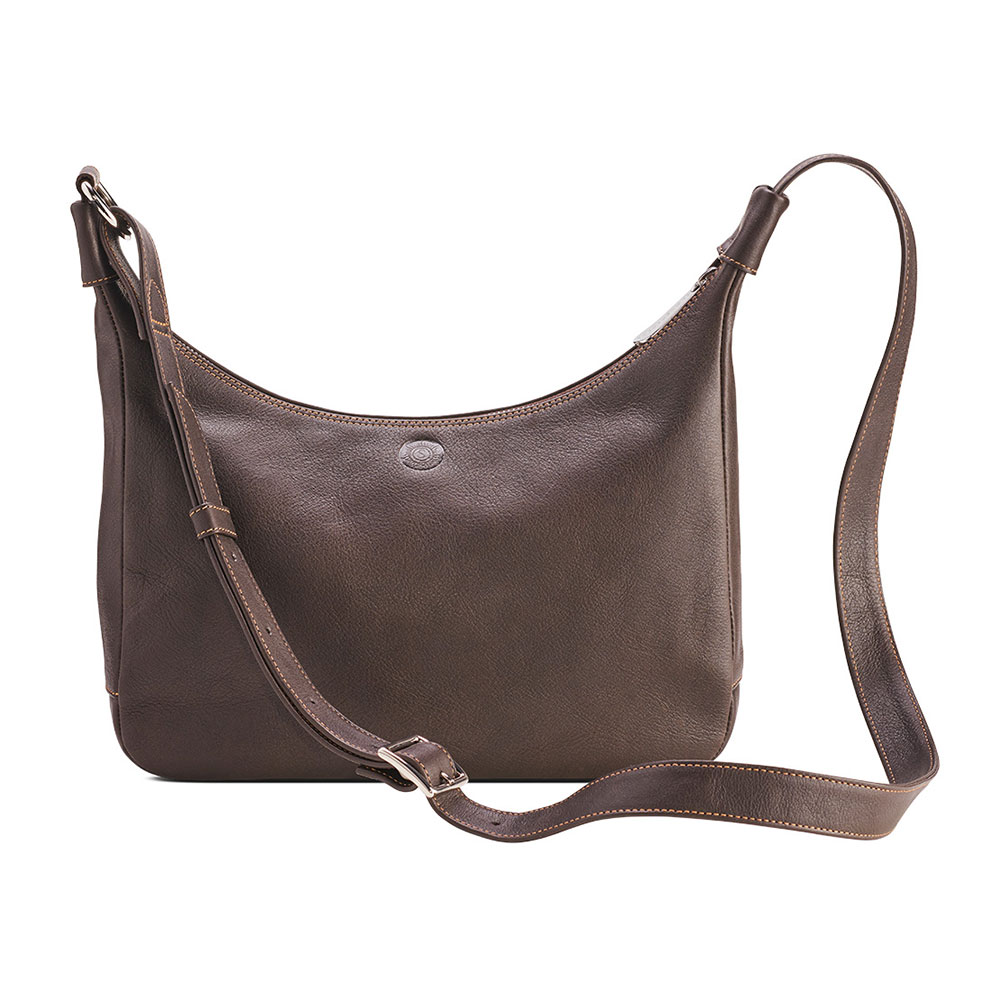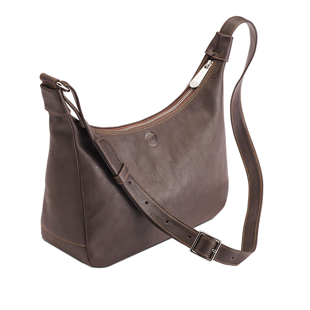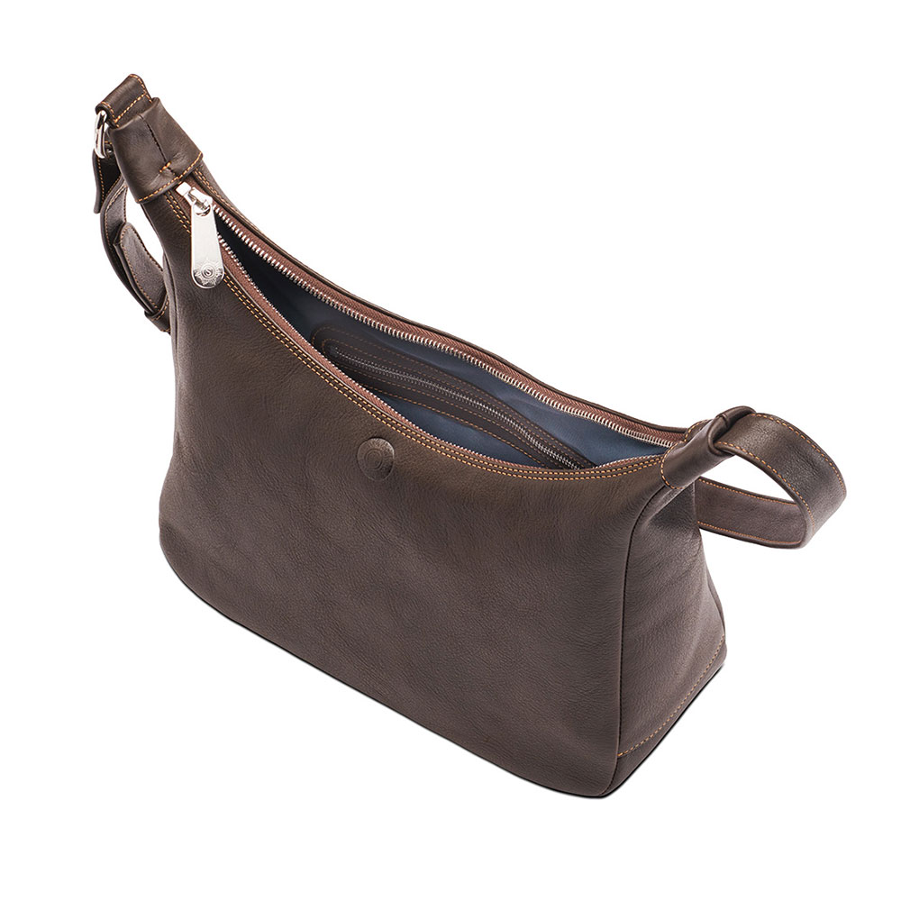 1 Hauptfach mit 1 zusätzlichen Reißverschlussfach · 2 Steckfächer für Telefon, Stifte, Geldbörse · verschließbar durch 1 Reißverschluss · verstellbarer Ledertrageriemen, 2,5 cm breit · geeignet für A5-Unterlagen.
