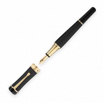Der Füllfederhalter Le Bonheur Night ist aus schwarzem Edelharz matt und glänzend gearbeitet, die handgefertigte Feder ist aus 750/- Gelbgold mit Sternschnuppenmotiv verziert, Beschläge und Clip sind vergoldet.