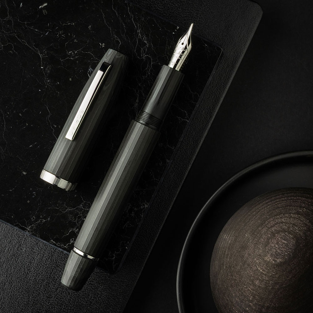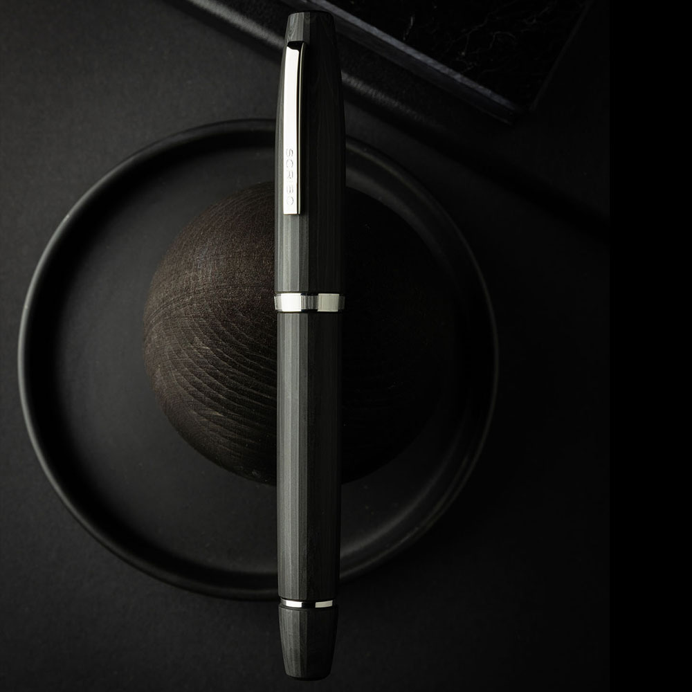 FLOW Dimensione drückt sich in einem tiefen, schlichten, fast architektonischen Anthrazitgrau aus. Es ist die Farbe des inneren Raums, in dem das Denken seine Form annimmt. Die Facetten zeichnen ein auf internationaler Ebene einzigartiges Profil und bieten einen natürlichen, präzisen Halt, der die Bewegung nahtlos begleitet. Das leise Geräusch der Feder auf dem Papier – zart, rhythmisch, unverwechselbar – wird Teil des Schreiberlebnisses selbst.