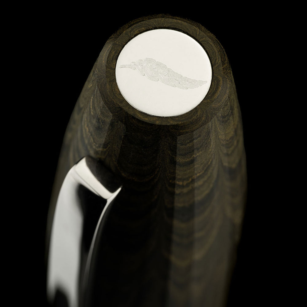 Der FLOW Memoria ist aus mattem Ebonit gefertigt, einem lebendigen, tiefgründigen Material, das die Wärme dessen speichert, der es in den Händen hält und bringt diese Entwicklung durch Farbe und Licht zum Ausdruck. Mit handwerklicher Geduld gedrechselt, vermittelt das Ebonit beim Anfassen ein warmes, fast organisches Gefühl: ein Material, das sich im Laufe der Zeit unmerklich verändert und die Spuren des Gebrauchs als Zeichen der Zugehörigkeit annimmt.