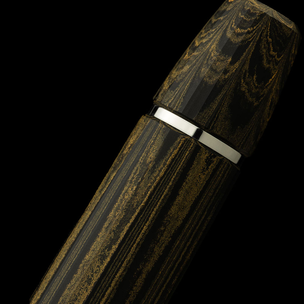 FLOW Memoria präsentiert sich in einem tiefen Anthrazit, durchzogen von ockerfarbenen Adern, wie Strahlen uralten Lichts, die aus einer dunklen Materie hervortreten. Hier hat sich der Fluss niedergelassen und Spuren hinterlassen. Die unregelmäßigen Nuancen des Ebanits machen jedes Exemplar zu einem Unikat und unterstreichen die handwerkliche Bestimmung eines Objekts, das vollständig in Italien entsteht: Von der Bearbeitung des Korpus bis zur Endbearbeitung, von der Montage bis zur Endkontrolle wird jedes Detail mit akribischer Sorgfalt verfolgt, wie es sich für etwas gehört, das für die Ewigkeit bestimmt ist.