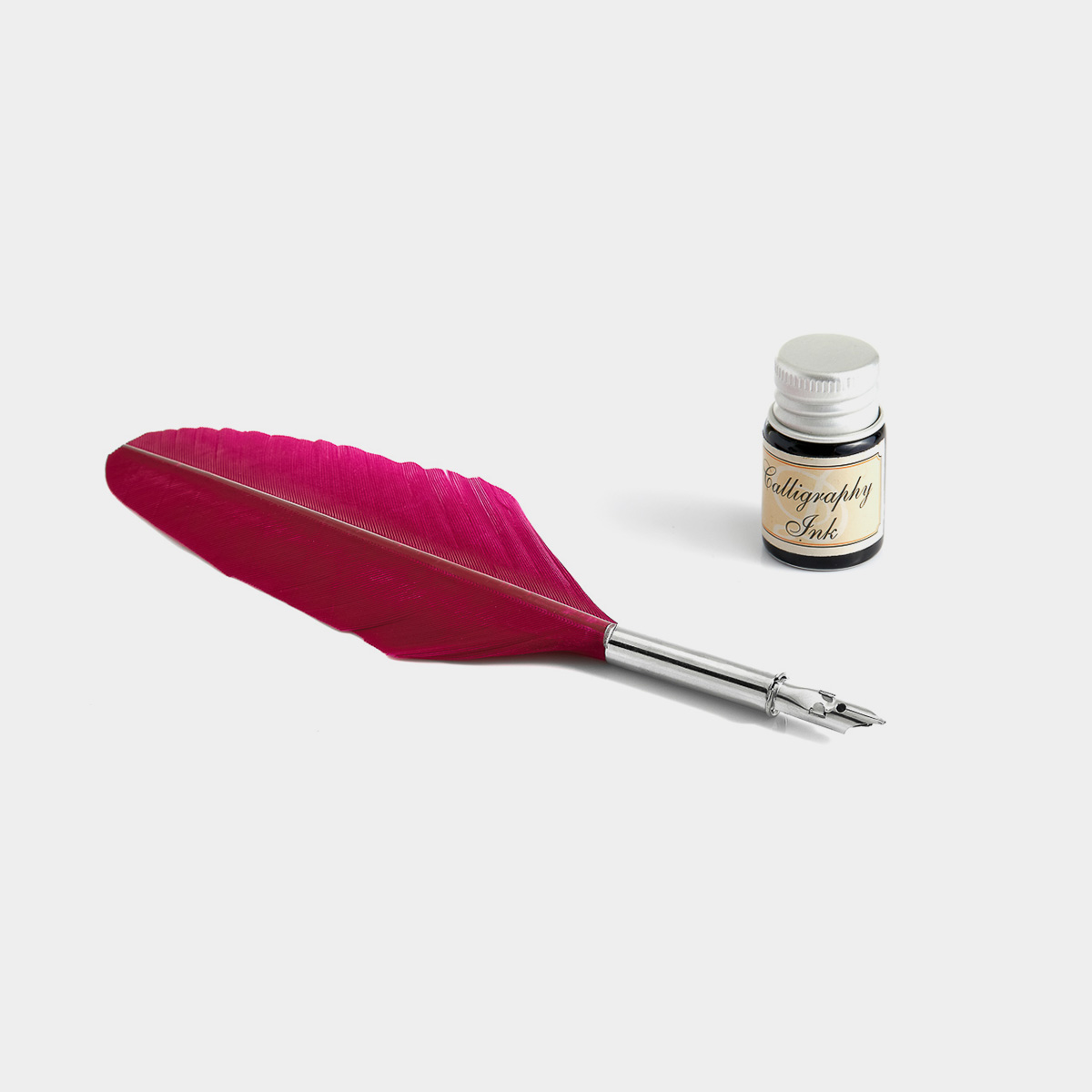 Diese Kalligraphiefeder wird aus einer Truthahnfeder und einer behandelten Metall-Legierung für die Halterung hergestellt.