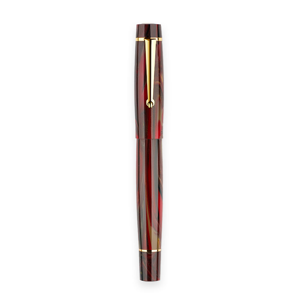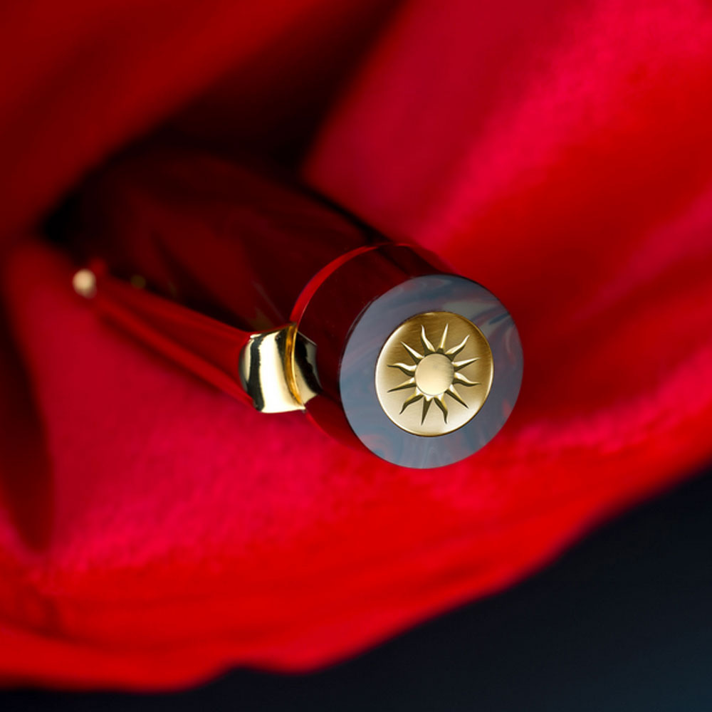 Dieser Füllfederhalter aus tiefrotem Harz, verziert mit vergoldeten Metalldetails, verkörpert den Reichtum und die Ausdruckskraft der Barockkunst. Die auffällige Kombination aus intensivem Rot und warmem Gold erinnert an die Opulenz der Meisterwerke des 17. Jahrhunderts und an architektonische Pracht.