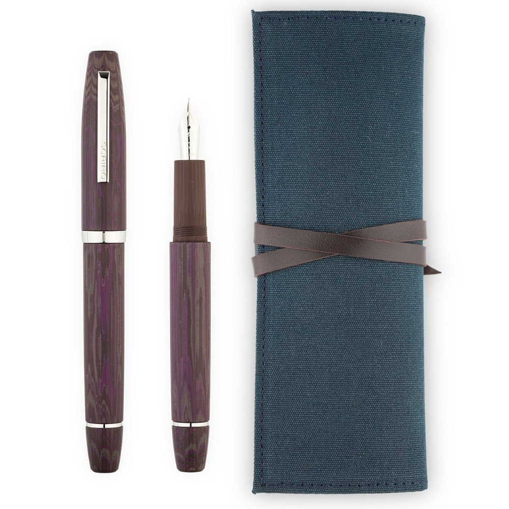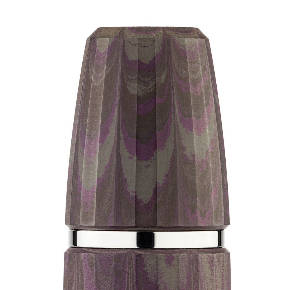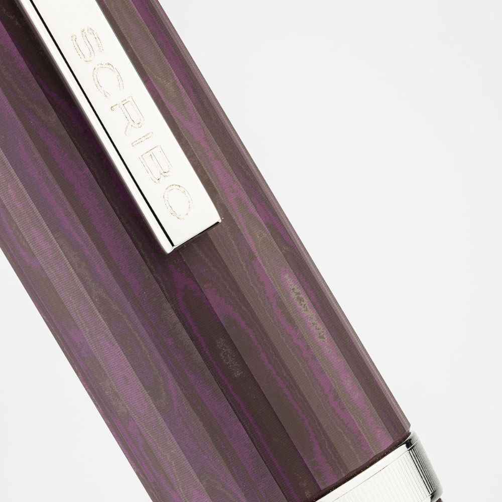 Die Scribo Flow Armonia Füllhalter präsentieren sich dank des gewählten Ebonit Materials hell- bis dunkellila mit schwarzen Streifen.