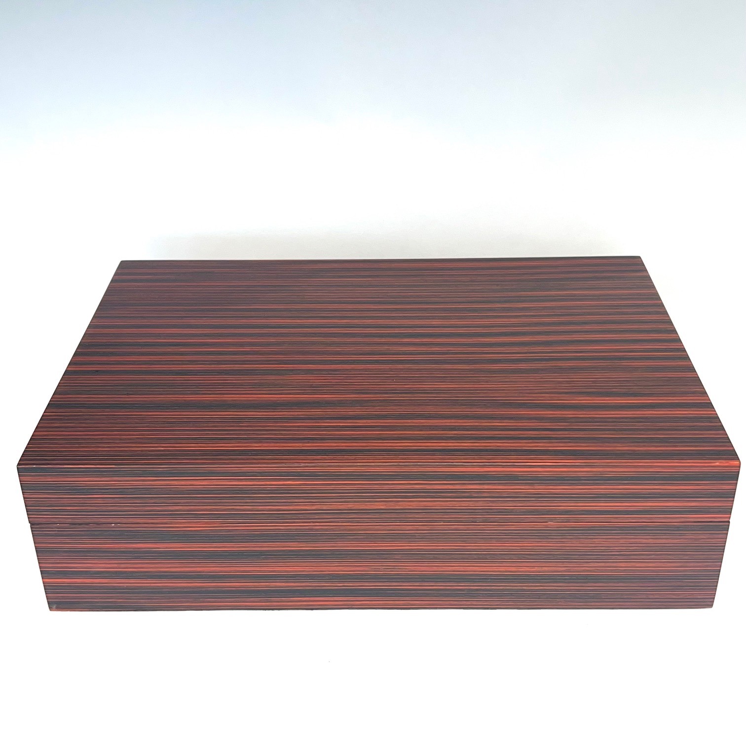 Dank des geringen Platzbedarfs der Schatulle, die Abmessungen betragen 31 cm auf 21 cm bei 8,5 cm Höhe, kann diese sowohl auf dem Schreibtisch als auch im Regal Platz finden. Der mit Samt beschlagene Boden verhindert das Verkratzen des Untergrunds und das Verrutschen auf glatten Oberflächen.